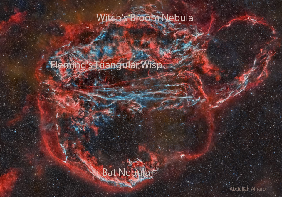 Des filaments comme ceux-ci sont tour ce qui reste visible d’une ancienne étoile de la Voie lactée. Il y a environ entre 10 000 et 20 000 ans, cette étoile a produit une supernova laissant derrière elle la nébuleuse du Voile. À l'époque, le nuage en expansion était probablement aussi brillant qu'un croissant de Lune, restant visible pendant des semaines pour les personnes vivant à l'aube de l'histoire. Aujourd'hui, le rémanent de supernova, également connu sous le nom de Boucle du Cygne, a disparu et n'est désormais visible qu'avec un petit télescope pointé vers la constellation du Cygne. La nébuleuse du Voile est cependant immense : bien qu'elle se trouve à environ 1 400 années-lumière, elle couvre plus de cinq fois la taille de la pleine Lune. Cette photo a été prise au Koweït mi-2024 et présente la lumière émise par l'hydrogène en rouge et l'oxygène en bleu. Sur des images aussi profondes de la nébuleuse du Voile complète, même les lecteurs les plus attentifs pourraient ne pas être en mesure d'identifier les filaments emblématiques que l’on peut trouver en déposant le curseur de votre pointeur sur l’image. (Image Credit & Copyright: Abdullah Alharbi)