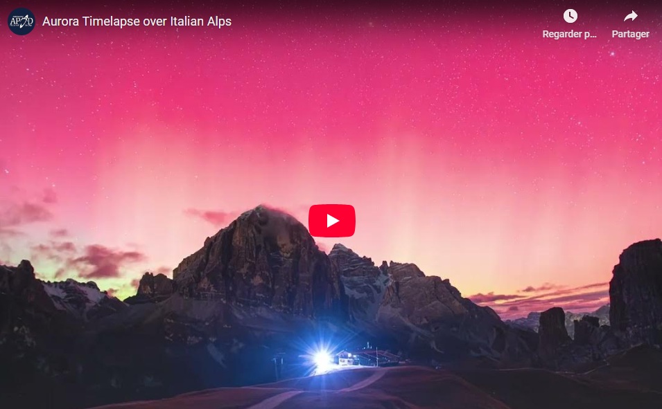 Avez-vous vu l’aurore boréale d’hier soir? Cette question a été posée dans une grande partie du monde il y a quelques jours, car une puissante tempête géomagnétique a produit des aurores visibles inhabituellement loin des pôles de notre planète. Cette tempête a été le résultat d’une éruption solaire géante de classe X mardi qui a éjecté des électrons et des protons énergétiques dans le système solaire, lesquels ont pénétré le champ magnétique de la Terre. La lueur rouge de l’aurore de cette animation vient des atomes d’oxygène de la haute atmosphère. Cette vidéo en accéléré montre l’aurore et ses traînés verticales dansantes sur une période d’une heure dans le ciel de Cortina d’Ampezzo au-dessus des Alpes dans le nord de l’Italie. Les étoiles de notre galaxie, la Voie lactée, parsèment l'arrière-plan tandis que les traînées des avions et des satellites ponctuent le premier plan. La forte activité récente de notre Soleil devrait continuer à produire des aurores boréales pittoresques au-dessus de la Terre au cours de l'année prochaine. (Video Credit & Copyright: Cristian Bigontina)