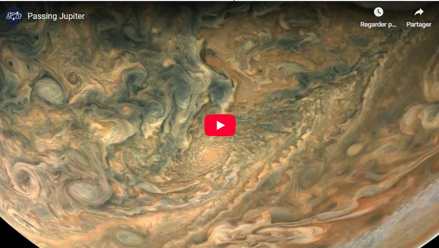 Voici Jupiter. La sonde spatiale Juno de la NASA poursuit encore ses orbites très allongées autour de la plus grosse planète du système solaire. Cette vidéo provient des images prises par la sonde Juno lorsqu’elle est passée depuis son arrivée en 2016 pour la 11e fois au périjove de la planète au début de l’année 2018. Cette vidéo en accéléré dont les couleurs ont été rehaussées couvre un intervalle d’environ quatre heures. La vidéo commence avec le lever de Jupiter alors que Juno s’en approche depuis le nord. Lorsque Juno a atteint le point le plus rapproché de Jupiter, à 3500 km au-dessus des nuages, sa caméra en lumière visible (JunoCam) a capté des images extraordinairement détaillées de l’atmosphère jovienne. Juno a survolé de près les zones claires et les bandes sombres qui ceinturent la planète, ainsi que les nombreuses tempêtes circulaires dont plusieurs sont plus vastes que les ouragans de la Terre. Après le passage de la sonde au périjove, on voit Jupiter s’éloigner et on retrouve les inhabituels nuages au sud de la planète. Pour obtenir de précieuses données scientifiques, la sonde passe si près de Jupiter que ses instruments pourraient bientôt tomber en panne à cause de leur exposition à de hauts niveaux de radiation. (Video Credit & License: NASA, Juno, SwRI, MSSS, Gerald Eichstadt; Music: Moonlight Sonata (Ludwig van Beethoven))