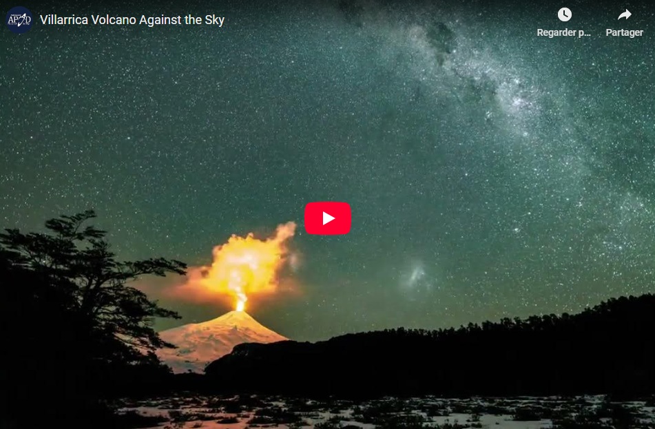 Lorsque Vulcain, le dieu romain du feu, des volcans et de la forge, brandit son marteau de forgeron, le ciel s'embrase. Une récente éruption du volcan chilien Villarrica est la vedette de la courte vidéo du jour, où l’on peut voir l’interaction entre le feu, fait de vapeur et de cendres incandescentes provenant de roches en fusion, et la lumière des étoiles lointaines de notre galaxie, la Voie lactée, et des deux Nuages de Magellan. Les astres ciel tournent au-dessus du volcan en raison de la rotation de la Terre sur elle-même. Notre planète, avec ses quelque 1350 volcans, rivalise avec Io, une des lunes galiléennes de Jupiter, comme l’un des astres du système solaire le plus actif géologiquement. Bien que ces deux mondes soient d’une beauté magnifique, l’origine des volcans diffère. Les volcans de la Terre sont généralement situés aux frontières des plaques tectoniques qui se déplacent lentement. Les volcans d’Io proviennent de la flexion gravitationnelle résultant de la force de marée exercée par Jupiter. (Video Credit & Copyright: Gabriel Muñoz; Text: Natalia Lewandowska (SUNY Oswego))
