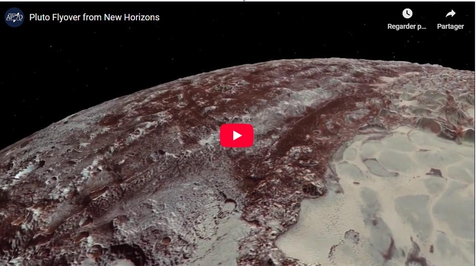 Que verriez-vous si vous pouviez survoler la planète naine Pluton? La sonde New Horizons l'a fait en juillet 2015 à une vitesse d'environ 80 000 kilomètres par heure et elle a capté de nombreuses images. Plusieurs de ces images ont récemment été traitées numériquement afin d'en rehausser les couleurs. Elles ont aussi été réunies pour produire cette vidéo de deux minutes. Au début de votre voyage, vous verriez la lumière qui s'élève sur des montagnes que l'on croit constituées de glace d'eau colorée par de l'azote gelé. Bientôt, vous pourriez apercevoir à votre droite une mer plane faite principalement d'azote solide qui s'est segmentée en d'étranges polygones. On pense que ces polygones proviennent d'un intérieur relativement plus chaud. Les cratères et les montagnes sont très répandus sur Pluton. La vidéo montre finalement la nuit qui tombe lentement et se termine au-dessus d'un terrain parsemé de crêtes de 500 m de hauteur séparés par des creux dont la largeur est de l'ordre du kilomètre. La vitesse de New Horizons est trop grande pour lui permettre de retourner vers Pluton, mais on peut cependant le diriger vers un petit corps de la ceinture de Kuiper dont la désignation est 2014 MU 69. La sonde devrait atteindre cette cible le 1er janvier 2019. (Credit: NASAJHUAPLSwRI, P. Schenk & J. Blackwell (LPI); Music Open Sea Morning by Puddle of Infinity)