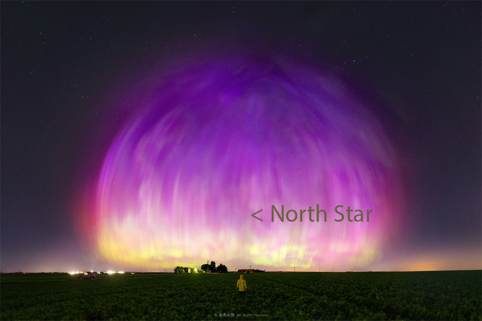 C’était la nuit, mais une partie du ciel brillait en violet. Cela s’est produit dans la désormais célèbre nuit du 10 mai 2024, nuit où les gens du monde entier ont signalé de magnifiques aurores dans les cieux. Cette photographie de six secondes d’exposition a été captée tôt le matin depuis Arlington au Wisconsin. Le nord est au centre de cette photo qui a été traitée pour rehausser les couleurs et pour supprimer les fils électriques. Le photographe (au premier plan) a rapporté que l'aurore semblait couler d’un point situé au-dessus de sa tête, mais qu’elle n’éclairait que le ciel vers le nord. Les particules responsables de cette aurore provenaient d’une EMC, éjectées du Soleil quelques jours auparavant, au-dessus de la région active AR 6443. Cette vaste région active a effectué une rotation vers la face cachée du Soleil la semaine dernière, mais elle pourrait bien survivre et revenir vers la Terre la semaine prochaine. (Image Credit & Copyright: Xuecheng Liu & Yuxuan Liu)