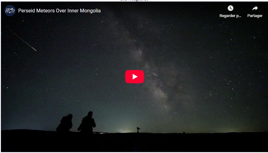 L’avez-vous vu? C’est l’une des questions les plus courantes lors d’une pluie d’étoiles filantes parce que c’est le temps qu’un météore éclaire le ciel est similaire à celui que prends une tête pour se tourner dans la trace lumineuse qu’il a laissée dans le ciel. Cependant, il est possible que la joie de voir des météores brillants traverser le ciel, tout en sachant qu'il s'agissait autrefois de petits cailloux sur un autre monde, puisse en valoir la peine, même si votre ou vos partenaires d'observation ne peuvent pas toujours partager votre expérience. Cette vidéo a été réalisée en réunissant de courts clips captés en Mongolie-Intérieure, en Chine, pendant la pluie des Perséides de 2023. Plusieurs des traces lumineuses produites par les météores ont été captées pendant un enregistrement audio en direct. Les Perséides de 2024 ont également produit de nombreux et magnifiques météores. Une autre pluie d’étoiles filantes spectaculaires est celle des Géminides. Le maximum d’activité de cette pluie est à la mi-décembre. Cette année, la Lune ne devrait pas nuire à l’observation de cette pluie, elle sera à peu près nulle, car il s’agira d’une nouvelle lune. (Video Credit: Jeff Dai (TWAN); Music: Ibaotu catalog number 771024 (Used with permission))