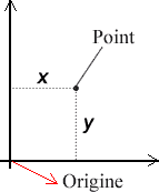 Comme le montre cette figure, il suffit de mesurer deux distances pour situer un point sur une surface plane. Les deux droites perpendiculaires servent de repères. Le point d'intersection de ces deux droites est l'origine du système : l'endroit où x et y valent zéro. |