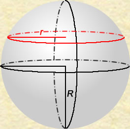 À la surface d'une sphère, il faut utiliser des cercles à la place des droites. On utilise deux grands cercles, c'est-à-dire des cercles dont le rayon est le même que celui de la sphère (R sur la figure). Nous verrons plus en détail comment on procède plus loin. Le rayon r d'un petit cercle est inférieur à celui de la sphère. |