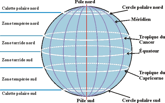 Certains parallèles ont des noms spéciaux. Ces noms sont reliés au phénomène des saisons. Nous étudierons ce sujet plus loin. La figure ci-dessous montre ces parallèles ainsi que les zones climatiques qu'ils délimitent.