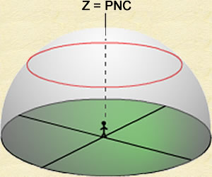 Toutes les étoiles de l'hémisphère nord effectuent un mouvement de rotation de l'est vers l'ouest autour de la ligne joignant l'observateur et le pôle Nord céleste (PNC). Ces étoiles sont visibles pendant la nuit de six mois. Elles sont toujours au-dessus de l'horizon pendant la journée de six mois, mais elles ne sont pas visibles. Nous verrons pourquoi la nuit et la journée durent six mois à la section 3.3. |