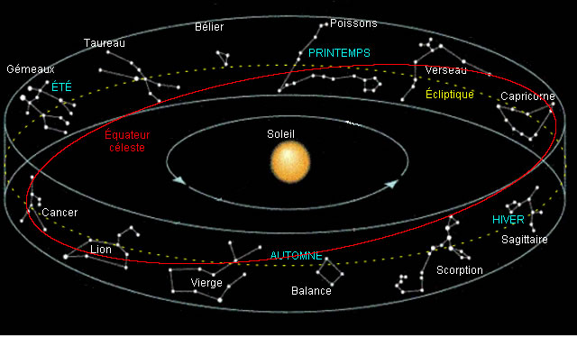 À cause de la révolution de la Terre, le Soleil se déplace sur la sphère céleste durant l'année.