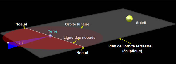 Le plan de l'orbite de la Lune est incliné de 5°9' par rapport à l'écliptique. Les deux points de rencontre entre l'orbite lunaire et l'écliptique sont les « noeuds ». La prochaine fiche montre que ces points ne sont pas fixes.