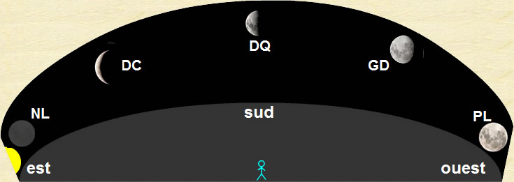 Plaçons le Soleil à une position donnée et demandons-nous où se trouve la Lune pour une certaine phase. Par exemple, où se trouve la Lune du dernier croissant (DC) au lever du Soleil? Pour répondre, il suffit de savoir où est la Lune par rapport au Soleil à la phase du DC. La section précédente nous indique qu'elle est à 45° à l'ouest du Soleil. Lorsque le Soleil se lève (à l'est), la Lune est donc à 45° à l'ouest de celui-ci, soit au sud-est. La figure ci-dessous indique les positions de chaque phase de la Lune au lever du Soleil.