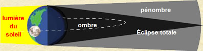 Lorsque la Lune passe dans le cône d'ombre de la Terre, l'éclipse est totale. Mais la Lune n'est pas totalement invisible. La lumière, surtout dans le rouge, déviée par l'atmosphère de la Terre continue d'éclairer la Lune.