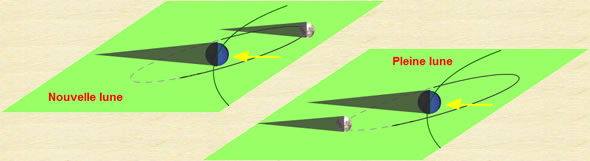 Pour qu'une éclipse se produise, il faut que la Lune et le Soleil soient dans le voisinage d'un noeud. La plupart du temps, la Lune est soit en haut du plan de l'écliptique ou en bas comme le montrent les deux figures ci-dessous. Il n'y a pas d'éclipse parce que ni l'ombre ni la pénombre n'atteignent la Terre ou la Lune.