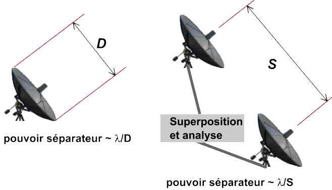 L'interférométrie consiste à superposer les signaux de deux ou plusieurs radiotélescopes. La superposition doit être exacte dans le temps. Plus la fréquence des signaux est élevée et plus la distance entre les radiotélescopes est grande, plus la superposition est délicate. Mais, le pourvoir séparateur est meilleur lorsqu'on augmente la distance S entre les radiotélescopes.