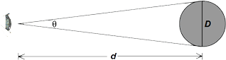 On peut calculer le volume d'une planète si l'on connaît son diamètre D. La figure montre qu'il suffit de connaître la distance d et l'angle q que fait la planète. On obtient ces valeurs par l'observation.