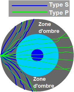 Les ondes primaires (ondes P) d'une secousse sismique se propagent dans un liquide alors que les ondes secondaires (ondes S) ne le font pas. La figure montre comment on peut alors déduire des renseignements sur l'intérieur de la planète. Par exemple, les ondes de type S ne traversent pas le centre de la Terre ; on en déduit que son noyau externe est liquide.