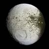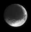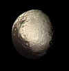 Cette photographie vient de la mission Cassini alors que le vaisseau se trouvait à 3 millions de kilomètres d'Iapetus, le 3 juillet 2004. La partie sombre est également visible; ce n'est pas un effet d'ombre, la surface est vraiment noire. (PIA06100, NASA/JPL/SSI) |