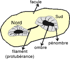 Les taches solaires sont la troisième structure visible de la photosphère. Elles sont intimement liées au champ magnétique du Soleil. Elles se présentent en groupe de deux, l'une étant de polarité magnétique nord et l'autre de polarité sud.
