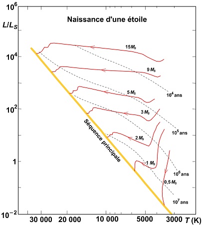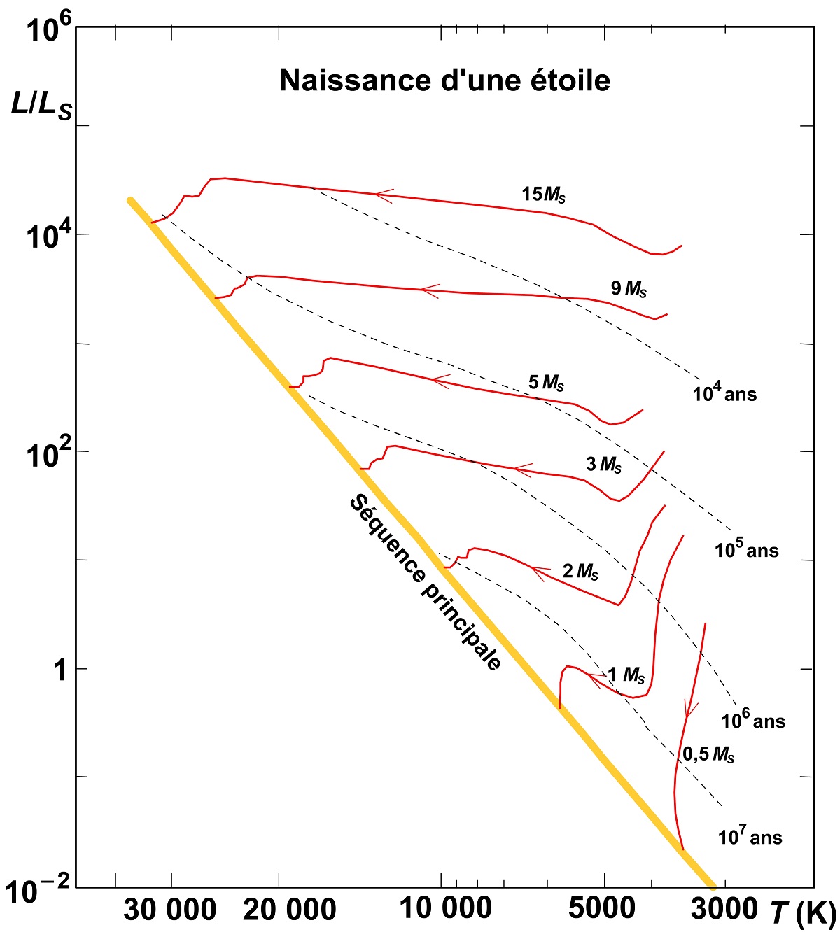 Juste avant de devenir une étoile de la séquence principale, la luminosité d'une protoétoile chute brutalement parce que son atmosphère devient opaque à la lumière. L'opacité de l'atmosphère provoque aussi une hausse de la température. Le graphique ci-contre montre la chute de luminosité et l'augmentation de la température pour diverses étoiles de masse différente.