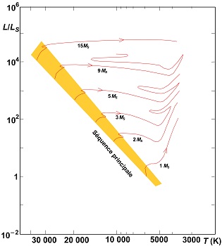 La luminosité et la température de la surface d'une étoile de masse voisine du Soleil augmentent lorsqu'elle vieillit. Pour une masse supérieure à 2 masses solaires, la température diminue alors que la luminosité augmente. Notez que les courbes des étoiles de 1 MS et de 2 MS sont incomplètes : la boucle vers la gauche a été omise (Adaptation Simon F. Green et Mark H. Jones, Sun and Stars, page 199.)