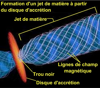 La chute de matière vers le trou noir est accompagnée d'émission intense de radiations, dont des rayons X. Le disque d'accrétion de la matière qui s'engouffre dans le trou noir est aussi à l'origine d'un champ magnétique intense qui lui est perpendiculaire. Si la quantité de matière ingurgitée par le trou noir est trop importante, un jet de particules est émis à haute vitesse le long de ces lignes de champ, donc perpendiculairement au disque d'accrétion.