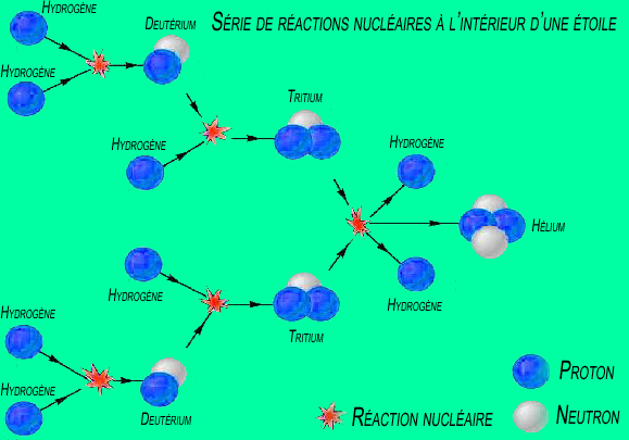 Sous l'effet de mécanismes que l'on commence à comprendre, la nébuleuse se contracte. Il se produit un effondrement et une fragmentation du nuage. La température et la densité s'en trouve ainsi donc largement augmentées. Les atomes commencent à s'entrechoquer et à se rassembler sous l'effet de la gravité, c'est la naissance d'une protoétoile. Lorsque la température atteint un niveau suffisant, l'hydrogène pourra alors subir une réaction nucléaire de fusion. Deux atomes d'hydrogène fusionnent et donnent du deutérium, qui fusionne avec un autre atome d'hydrogène pour former du tritium. Deux atomes de tritium fusionnent ensuite pour libérer deux atomes d'hydrogène et un atome d'hélium. Cette série de réactions libère l'énergie qui alimente une étoile. Voici un schéma qui illustre cette série de réactions.