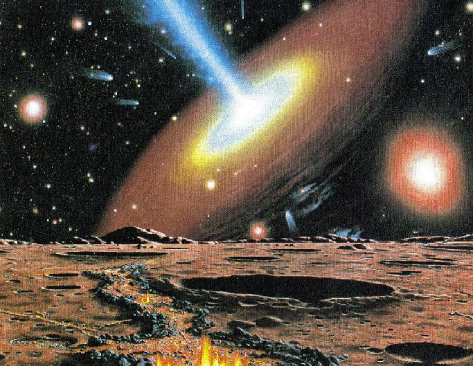 Si une masse de 3Ms suffit pour engendrer un trou noir à partir du cadavre d'une étoile, on peut s'imaginer quelle est la force gravitationnelle immense que crée un trou noir supermassif. Voici une représentation fictive d'un trou noir supermassif au centre d'une galaxie.