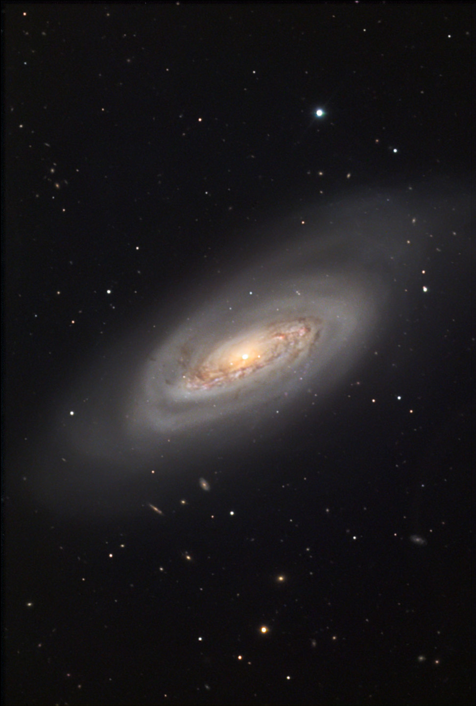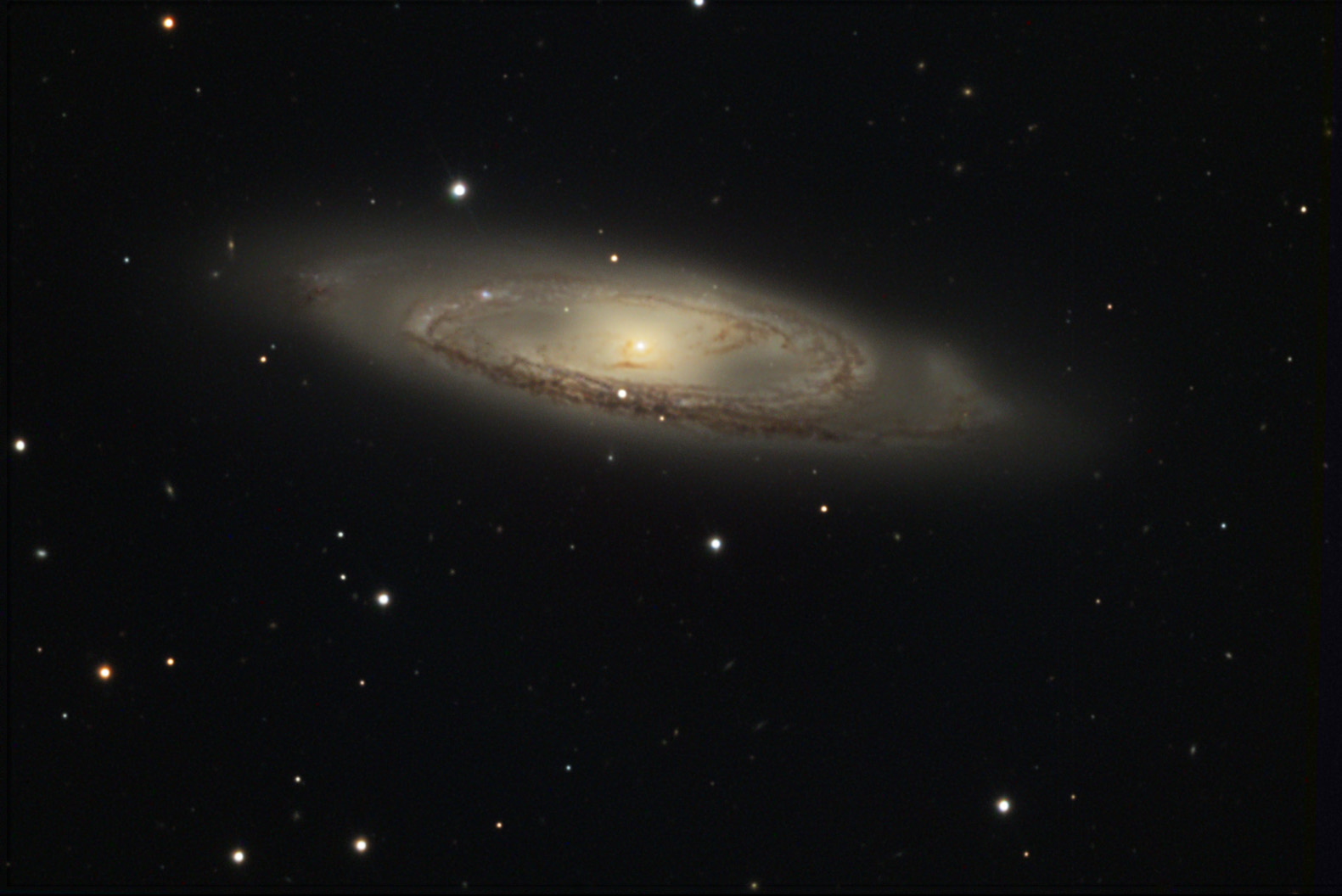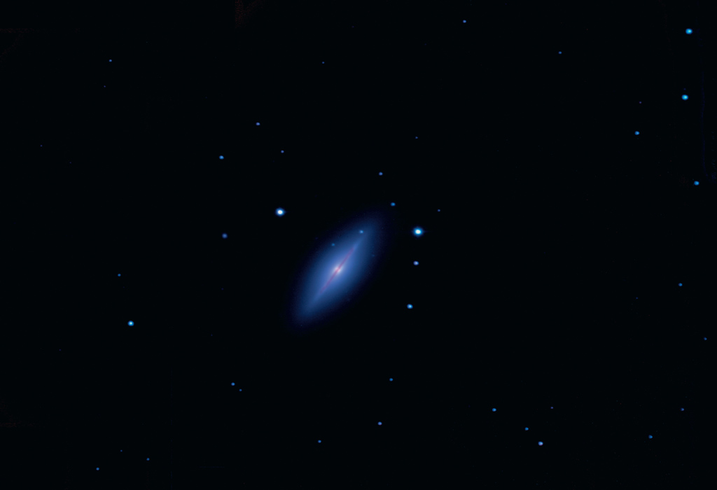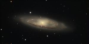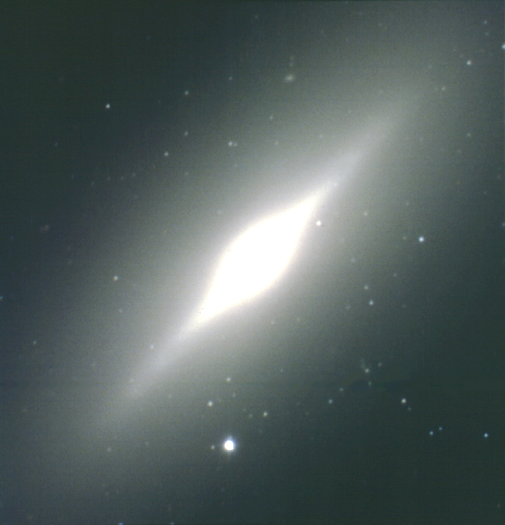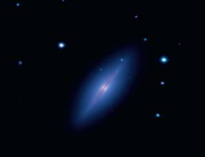 S0 NGC 5866 Cette galaxie est située dans la constellation du Dragon. C’est une galaxie de type lenticulaire (S0). Son noyau bombé, coupé par une bande de poussière épaisse est la forme particulière de cette classe de galaxie (Obersevatoire du mont Mégantic, OPIUM) |
