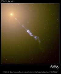 M87 une galaxie elliptique géante, située au centre de l'amas de la Vierge, possède une masse centrale de 3 milliards de masses solaires concentrée dans une sphère de 60 al de rayon. La miniature ci-contre montre cette galaxie (Hubble Heritage Team). C'est un trou noir. On pense qu'un trou noir central semblable à celui de la Voie lactée est à l'origine de toutes les émissions des GNA. (Cliquez sur la miniature pour agrandir.)