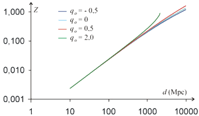 Le facteur de décélération qo indiqué sur le graphique doit son nom au fait que l'on pensait que l'expansion ralentissait sous l'effet de la gravité. Si c'est le cas, le facteur qo est positif, les deux courbes en haut de la droite bleue. Si au contraire, l'expansion s'accélère, le facteur qo est négatif, la courbe du bas.